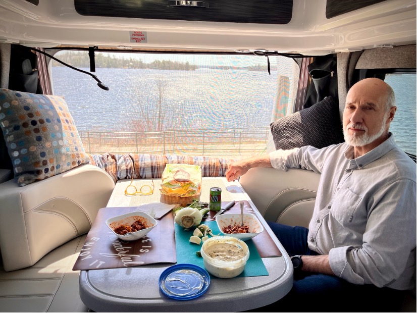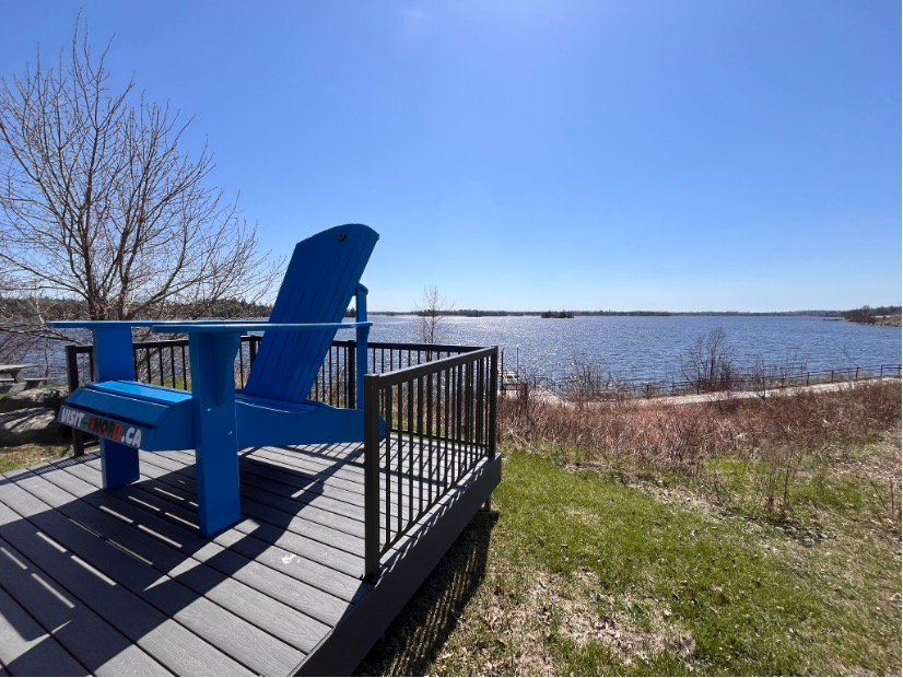 Presque résignés à acheter une carte d’eau pour s’approvisionner à Kenora, Ont. on effectue une dernière tentative au kiosque d’information et la gentille Morgan au comptoir nous annonce avoir approvisionné la veille des campeurs avec le boyau de la bâtisse. Eurékâ ! Cette pause nous permet de surcroit de découvrir l’immense Lake of the Woods qui abrite non moins de 14 546 lacs !!! Le spot parfait pour luncher.