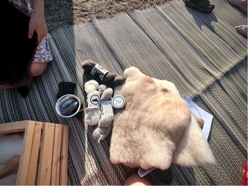 Pendant que Joey et Marc conversent, Christel et sa plus jeune fille me font état des produits de leurs moutons (peau, laine, tricots, viande d’agneau et baume corporel.
