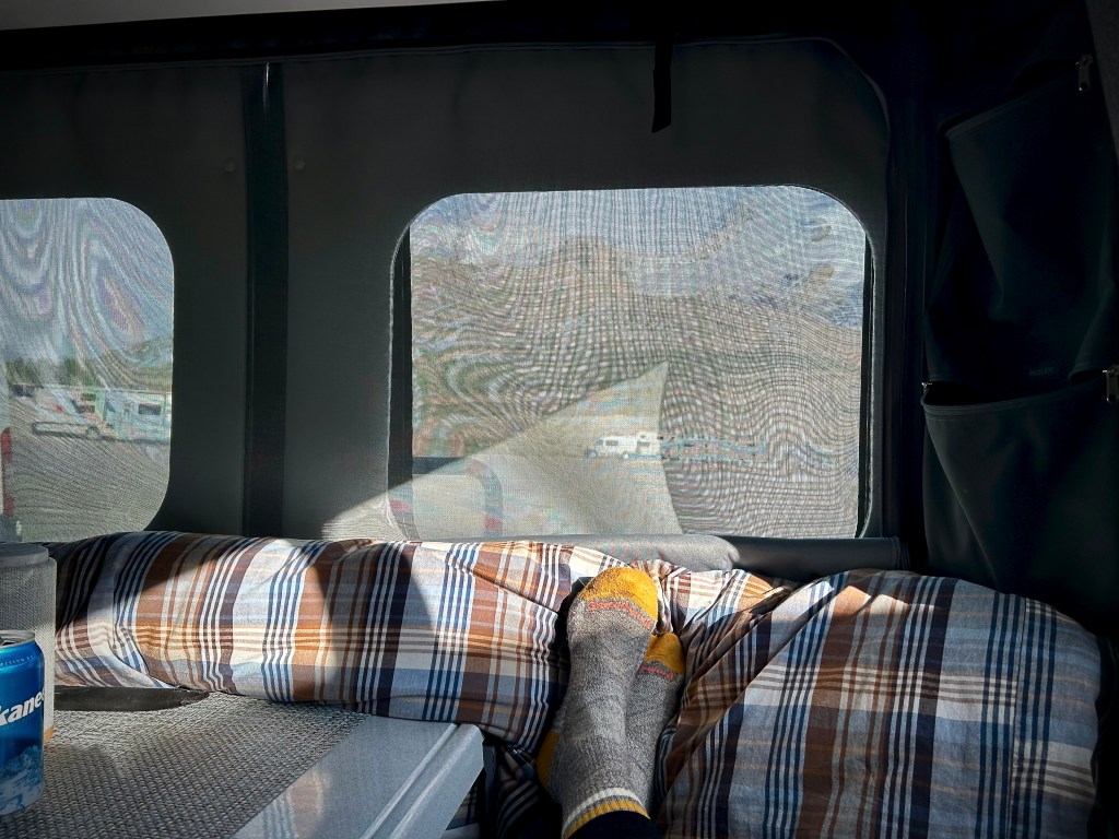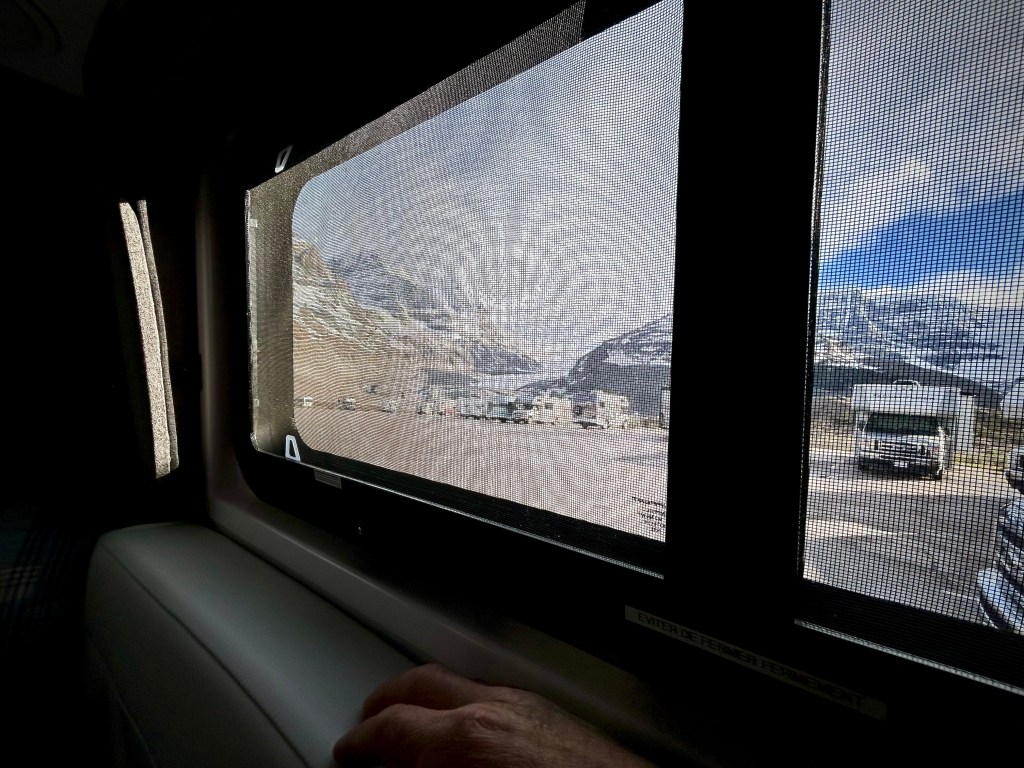 On aura tout juste le temps d’en parcourir les limites que nous nous échapperons du grésil et de la neige qui y tombent en cette fin de journée. Quelques instants plus tard et une fois installés pour la nuit dans le stationnement de motorisés en face (pour la modique somme de 17,50$ !), on admirera le soleil couchant se refléter sur la paroi enneigée. Moment magique… bien au chaud au creux de Virgil !