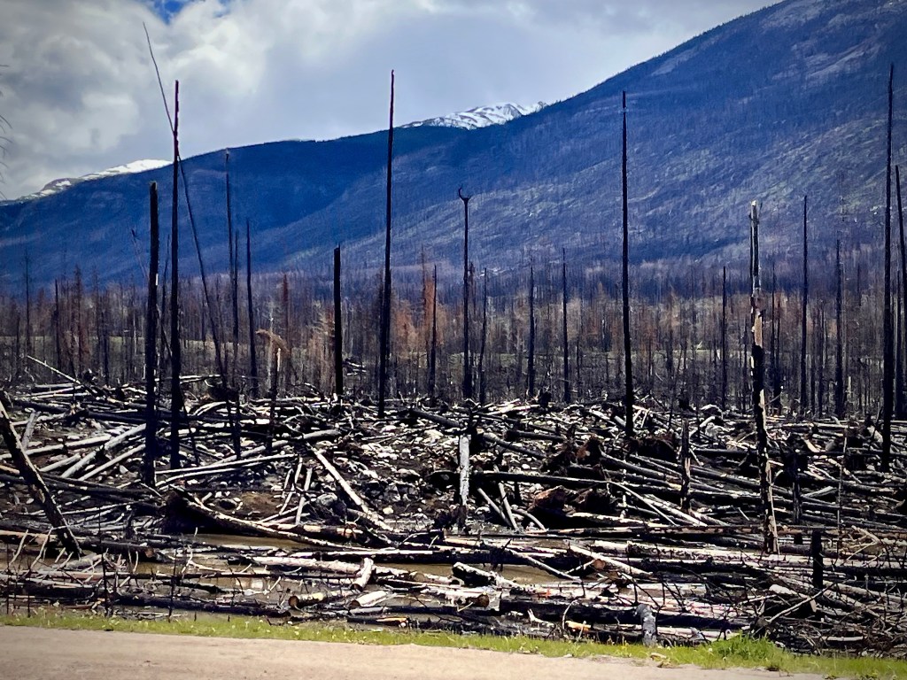 En arrivant à Jasper, on ne peut que constater la désolation causée par les feux de forêt qui y ont fait rage l’an dernier ; ça fait mal au cœur de voir ces grands espaces calcinés !