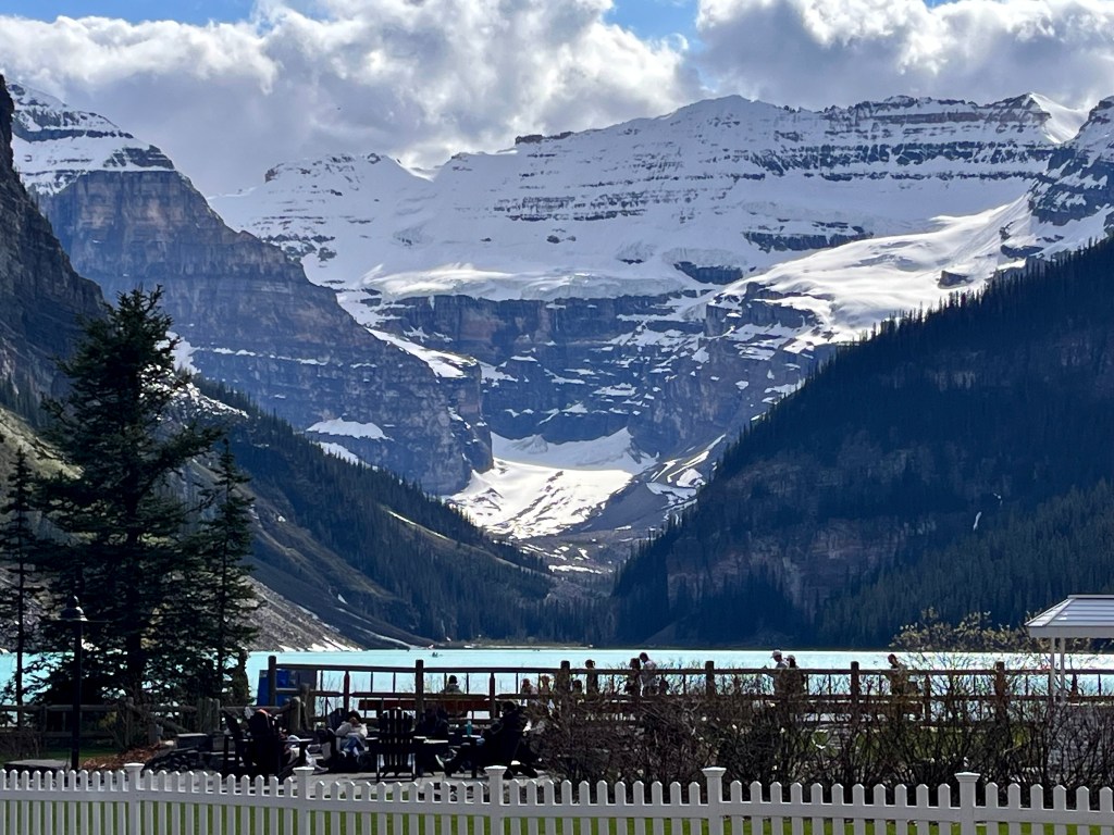 Bien que ce ne soit pas encore la haute saison touristique, la foule de visiteurs autour du lac semble indiquer tout le contraire ! Le serveur de la terrasse du Château Lake Louise, un p’tit gars de Victoriaville qui y travaille depuis 11 ans, nous dira qu’ils n’ont jamais vu autant de touristes si tôt au printemps. C’est bien ce que je croyais : ce sera un été qui ressemblera étrangement à celui de la pandémie… Bonne idée d’avoir choisi ce temps-ci pour visiter le Canada !