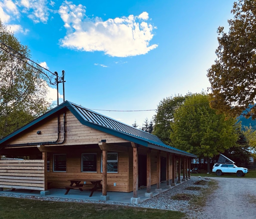Arrivés au Lamplighter Campground de Revelstoke, on réalise rapidement que, bien que la jeune Rachel au comptoir ait voulu nous faire plaisir en nous assignant un site avec foyer (un minuscule trou dans le sol!), on est bizarrement situés à la conjoncture des douches/laundromat/cuisine communautaire et de la dernière courbe avant l’entrée/sortie du camping, tellement que ça prendrait une clôture pour empêcher les gens de passer à quelques pieds de nous ! Trop crevés pour contester, on verra ça demain…