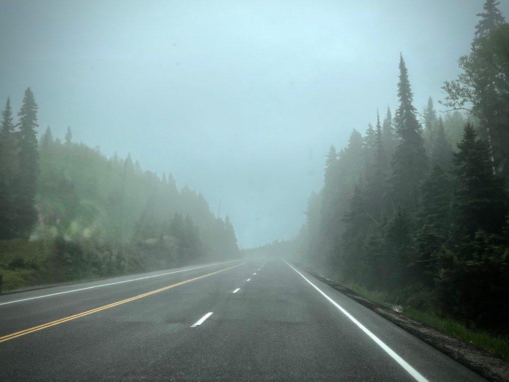 On s’embarquera pour un trajet de 4h30 sur une route où il n’y a que du bois, du bois et du bois! On y laissera 1 heure au passage, raccourcissant ainsi notre journée mais pas le trajet!